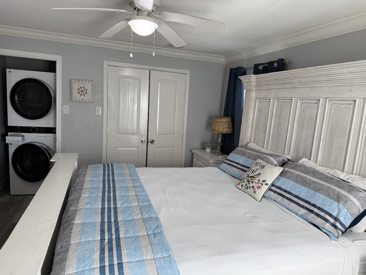 Welcome to your coast house! Walk to the water in sunny downtown Rockport. Cute modern casita with high end furnishings. 2 bedroom 2 bath house with additional twin day bed. 3 blocks walk to the water with slight water views from the back porch. Walking distance -5 blocks to coffee shops, restaurants, art galleries, wine bars & a short 1.4 mile walk to the Rockport beach. Perfect quiet getaway in the adjacent neighborhood to downtown, so you are close to all the fun, but peace and quiet at home.