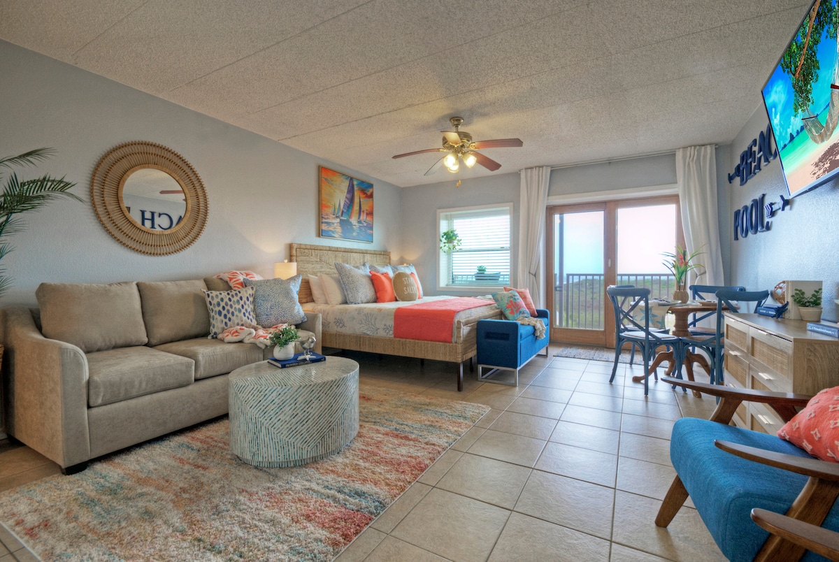 Panoramic ocean views. Private pedestrian beach access. Steps from the beach. Beautiful bright 3 bed/2ba penthouse. Fantastic location. This is what a beach vacation should be. *Must be 25 to rent* *No pets* Full, spacious kitchen. Full, separate Tiki bar. Master: King w/ ocean views and seven-shower-head walk-in shower. 2nd bed: King 3rd bed: Queen + Sleeper Sofa In Island Retreat w/ access to swimming pools, grills, game courts, & boardwalk. Parking for 3 cars. STR#248320