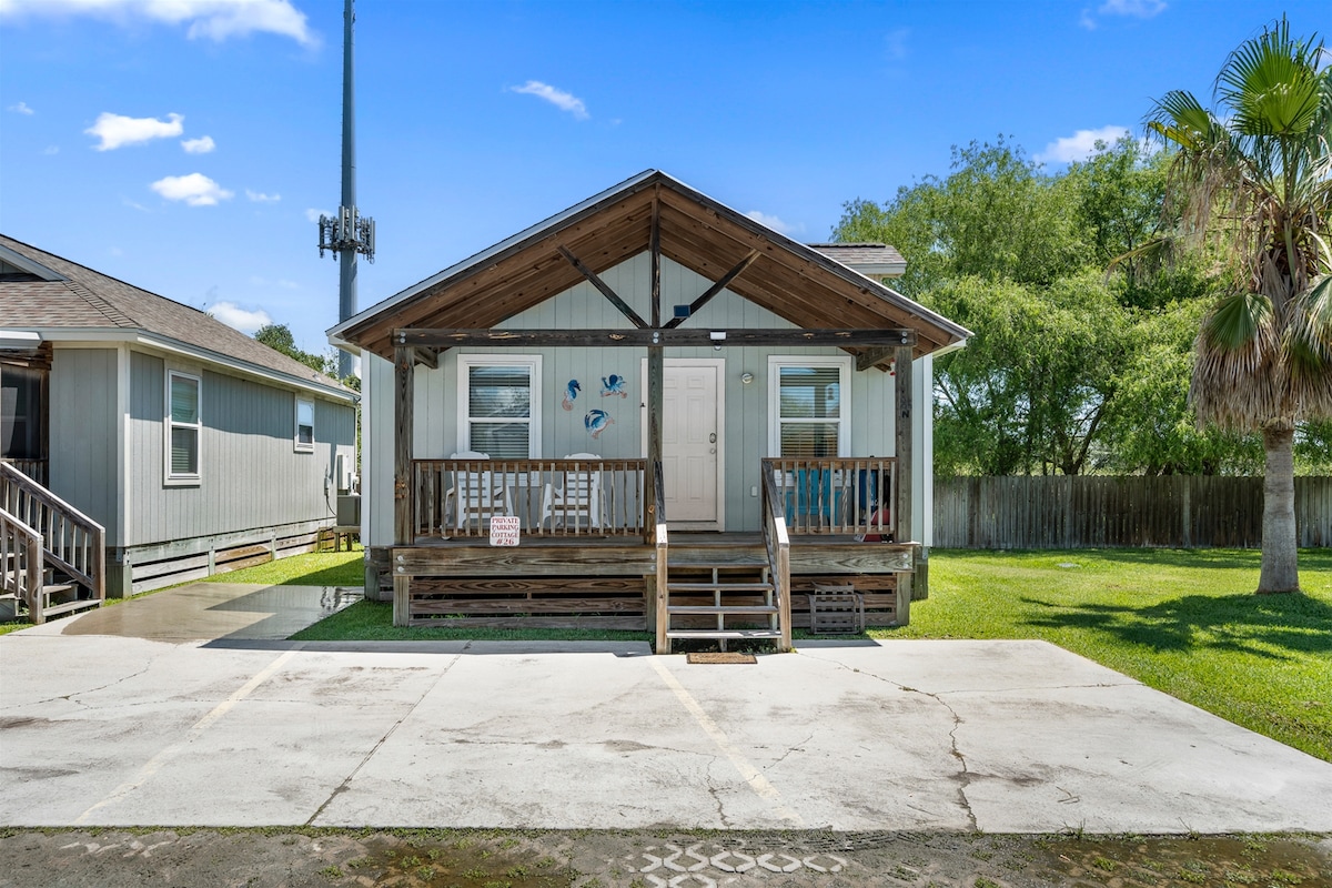 Fishers, hunters, Winter Texans, remote-workers, and folks just wanting to get away to the coast: make happy memories at this unique and family-friendly place. Dogs welcome. Located in Aransas Pass (Saltwater Heaven) and only seven miles to free ferry to Port Aransas beaches. Boat parking, covered car port, completely fenced yard, outdoor shower in the enclosed courtyard. The 550 square-foot cottage uses central air-and-heat, keeping you cool - no matter how hot it gets in South Texas.