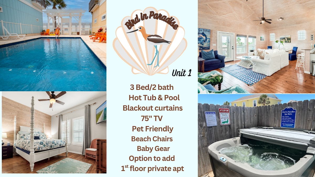 Sleep 17 at this amazing, family-friendly location! Come relax by the PRIVATE POOL! 2 homes, NO NEIGHBORS! 4 full bathrooms & 3 kitchens-3 story house has a master suite w/king bed, bunk room w/king bed, bunk bed & single bed, and second floor has a queen bed. Cottage sleeps 7, w/king bed, queen in the loft and pull-out sofa. Come stay at this Texas beauty. HOT TUB! Outdoor showers near the pool and garage for rinsing off after the beach!