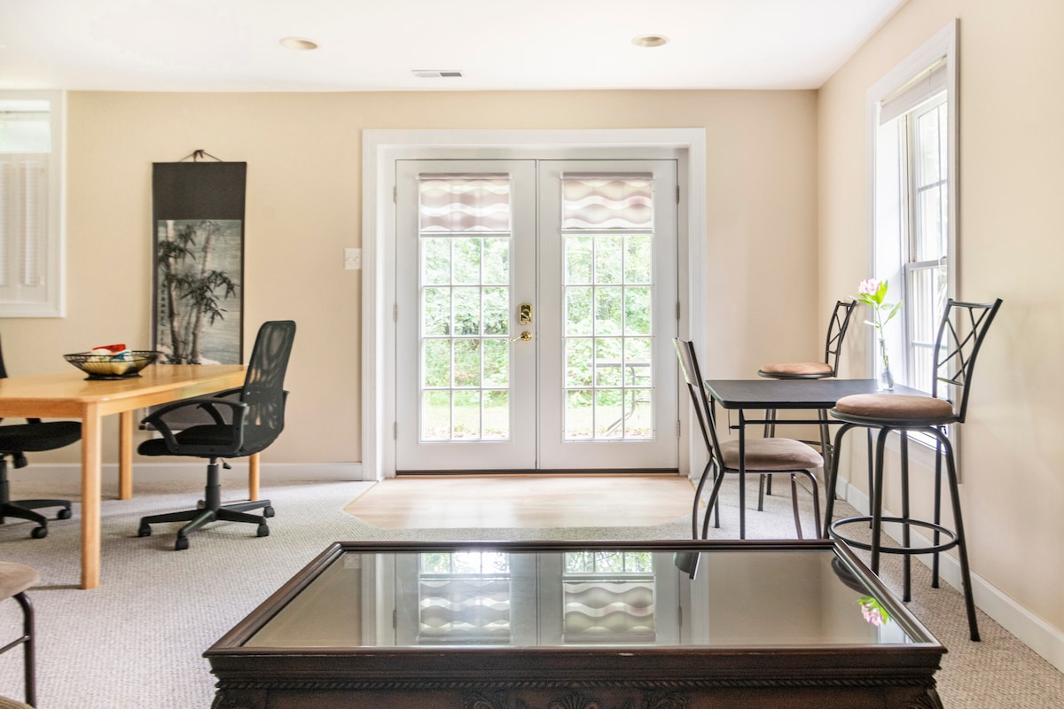 Our spacious, surprisingly bright Bethesda half-basement is nestled in a quiet neighborhood only minutes from Walter Reed, NIH, & the metro. Large windows offer a view onto a patio bordered with hydrangeas & evergreens; the bedroom has a queen-sized bed, a Samsung smart TV, & a desk. The Kohler shower head in the bathroom offers firm pressure and the mini-fridge & microwave are on hand for snacks. Short term rental license no. STR25-00162. Please note: There is no kitchen and no washer/dryer.