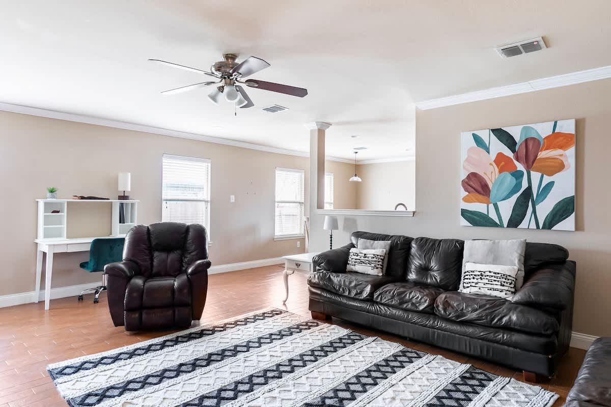 Relax in this modern Mediterranean home in a gated resort community in Rockwall, Texas. Enjoy an open layout, high ceilings, and stylish decor near Lake Ray Hubbard. Walk or drive to the marina, pool, gym, tennis courts, and golf course. Grill on the patio and unwind in a peaceful setting. Free street and private parking available. Month-to-month short-term rental at a discounted rate.