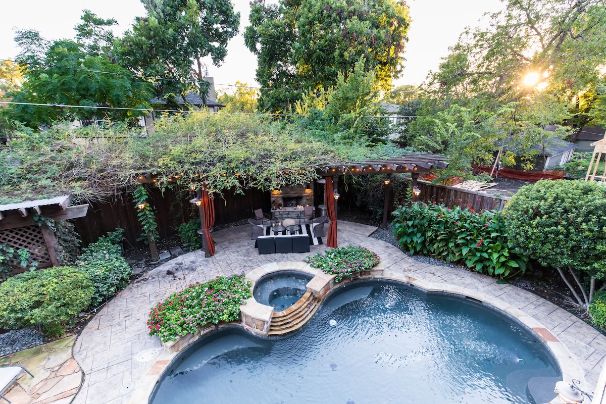 Welcome to our stunning retreat near Bishop Arts in Dallas! This exceptional house is the perfect sanctuary for your dream getaway, offering luxurious amenities, including a pool and hot tub, all within a prime location. As you step inside, the open-concept living area is bathed in natural light, creating a warm and inviting atmosphere. Step outside into your own private paradise. The backyard is a haven for relaxation and entertainment - featuring a massive covered deck and a pool/hot tub.