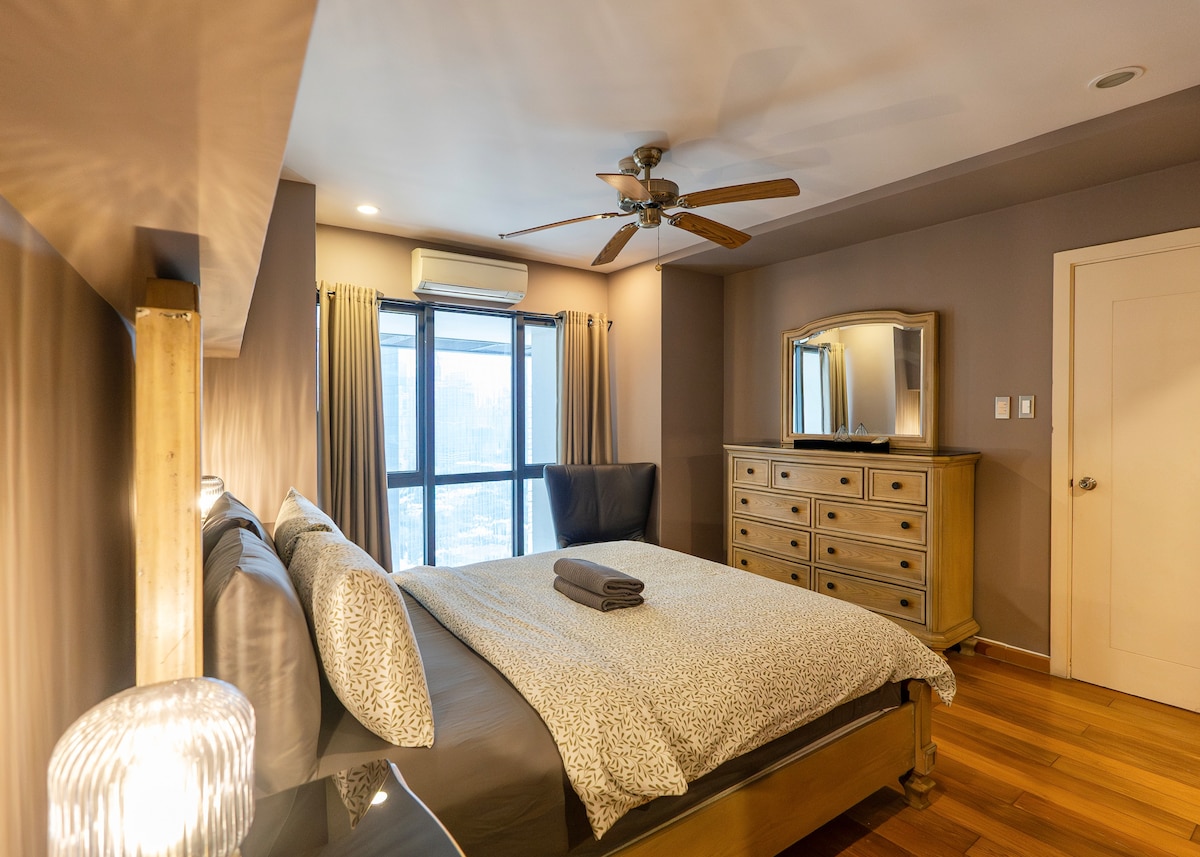 Your Executive retreat (30% off 7+ nights) includes: Ogawa full-body massage chair De'Longhi coffee bar + Marshall speakers Tempur Queen bed · Goose down pillows Crate & Barrel furnishings · 78 SQM Wraparound balcony · Rockwell skyline views Private outdoor dining set above the city Full blackout smart curtains Fully stocked kitchen · Complete toiletries 50" Samsung TV · Netflix · High-speed WiFi All included – Rooftop pool · Gym · Private parking Smart lock self check-in anytime 24/7 security