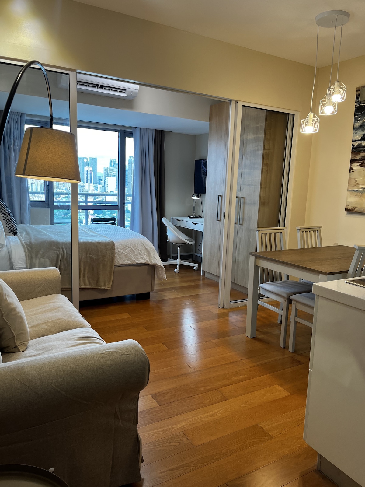 This unique place has a style all its own.Clean, safe and cozy Makati location in the heart of Metro Manila, in an eclectic and laid back neighborhood. 24/7 security. Free & fast Wifi. Quiet air con, large comfortable bed. Freshly renovated kitchen and bathroom fixtures. Variable lighting. Welcome and cold drinks. Spacious, Bright, Zen Abode with a Rockwell Skyline view for you to enjoy with company and friends. A relaxing, modern, well-equipped kitchen, a stunning home away from home.