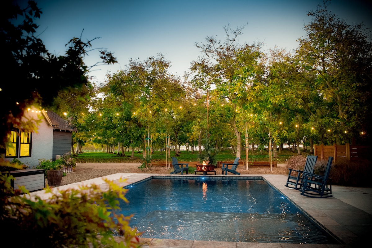 A very magical place we call home. Nestled in the middle of 20 acres of established walnut trees, lies your new favorite getaway! You can simply sit back and chill in the beautiful Orchard House or come outside and enjoy the patio/pool/barbecue/ fire pit and spa. One of the bedrooms listed is upstairs in a gaming tower, filled with entertainment options!! Also if you love animals as much as we do, you can help feed our furry and feathered friends .Either way....Prepare to fall in love!