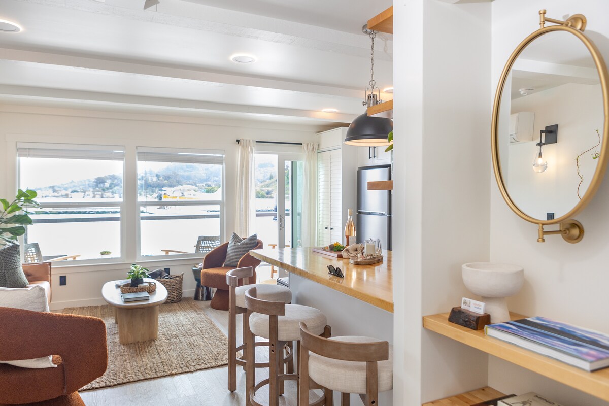 Reconnect with nature at this unforgettable waterfront escape. Bottom level of an updated houseboat with direct access to the floating dock, a full kitchen, and in-unit laundry. Enjoy outdoor gas firepit seating, perfect for sunrises and sunsets. You may even see a seaplane landing during your stay! Walk to the bike path and Club Evexia Fitness Center. Great base for SF, Marin, and Napa. Floating home on the water. Ask about long-term stays. Not suitable for children under 12 or pets.