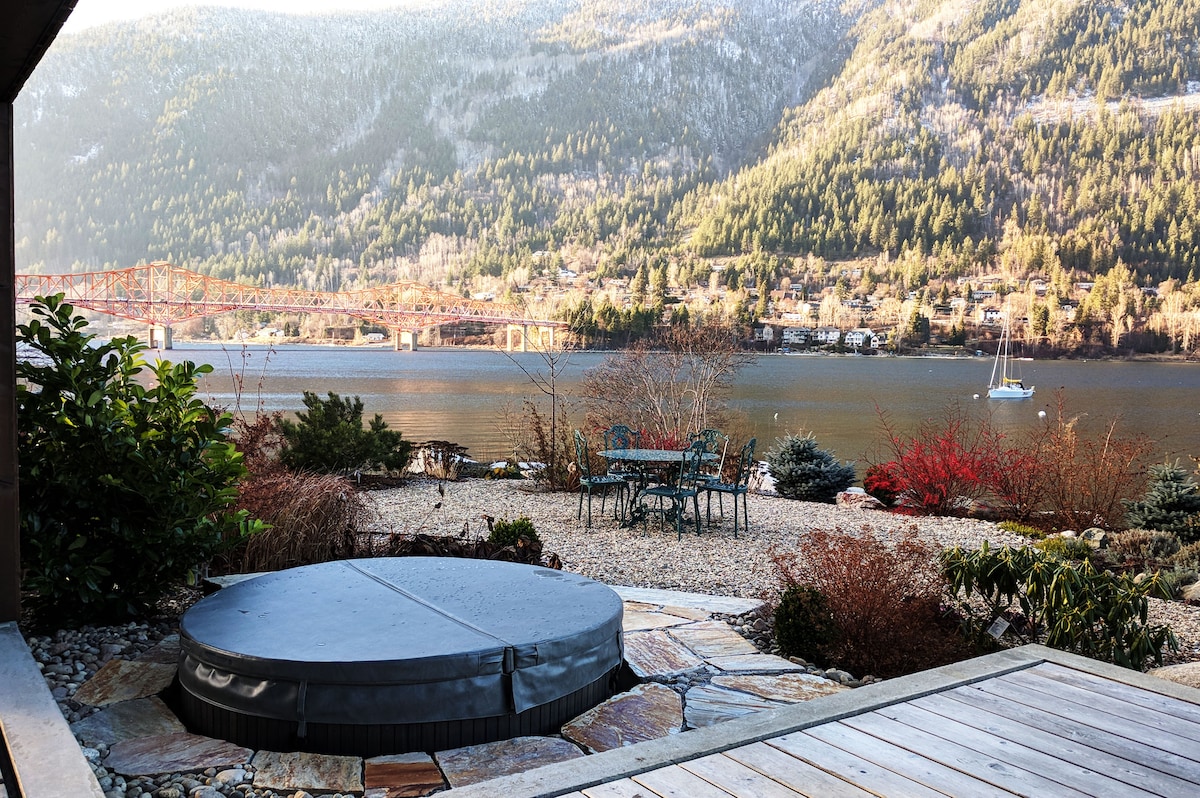 By the Lake is a welcoming, private suite situated in a beautiful, modern waterfront home with a stunning view over the lake and a lovely garden with a hot tub. Five minutes drive from downtown and 15 minutes from Whitewater ski area, provides refreshing hikes and skiing opportunities close by. Close access to shopping and restaurants. John's Walk lakeside path passes right by the house, leading you to attractive Lakeside Park. Our beach provides a peaceful spot to relax on the lake shore.
