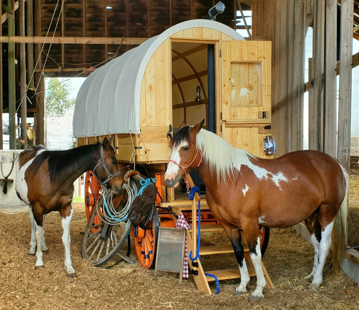 You'll love this unique and romantic escape. The Traveller Caravan is a replica of a Romani traveller caravan / vardo - upgraded with a queen-sized bed and a 2-pc bath rooom. The caravan also has a sleeping closet below the main bed for the little ones (double bed). There is an out door patio with a BBQ, fire pit and comfortable chairs. Breakfast is included as are costumes. It is located near our Burrow on the Good Knights themed park site.