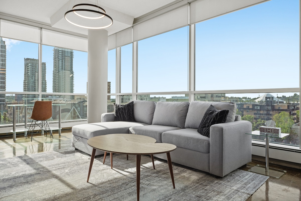 About this space This beautiful 1 bed and 1 den apartment is your home away from home. It offers all the convenience and comfort you need to make your trip memorable and comfortable Modern living space with floor to ceiling window that lets in plentiful and beautiful natural light, and offers amazing views of Downtown Calgary and Rocky Mountains in the distance Unbeatable location offers exceptional convenience to amenities and entertainment experiences. It's close to all public transportations.