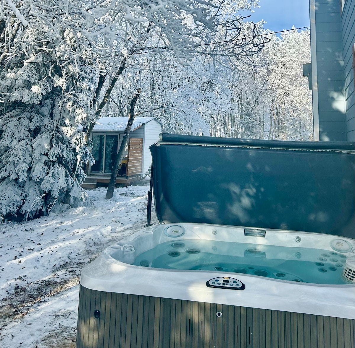 Cozy private cabin for two on a quiet 5-acre property, designed as a peaceful escape from everyday life. Enjoy a private hot tub under the trees, an outdoor fire pit, and a covered front porch with fire bowl—perfect for slow mornings and cozy evenings. Robes and all-weather slippers are included for easy trips between the cabin and hot tub in every season. This space is intentionally simple, calm, and restorative—ideal for a true reset. 🚿 Please note: No shower (heated toilet & sink only.