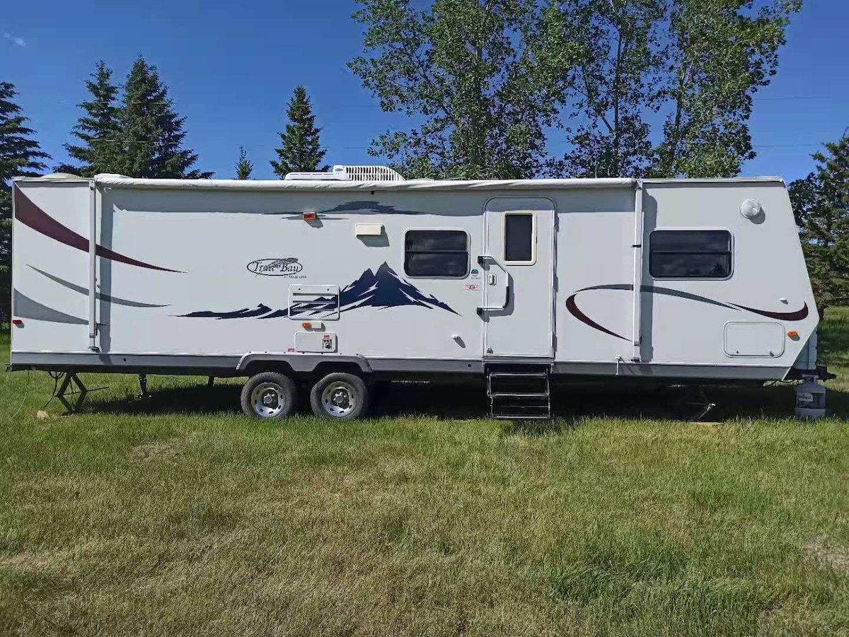 This travel trailer is situated on our park-like acreage, giving you the chance to enjoy a true camping experience. It features one queen bed, two single beds, one double bed converted from the couch and a full bathroom with a stand-up shower. Water line and sewage hookup. 15-amp power hookup. No Wi-Fi.