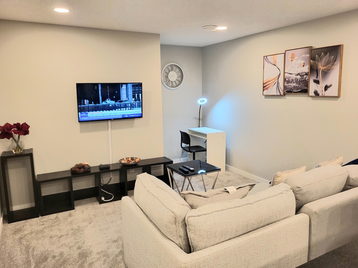 Charming 2-bedroom in NE Calgary (with 2 big Kings bed, separate entry and separate heating) Legal basement suite , 10min drive to Calgary airport, comfortable and Cozy. Spacious home with new modern furnishings, peaceful and family friendly environment. Every guest who stayed here, love it, base on review. Free Parking Space 10 mins to airport 6 min to train station Very close to bus station Close to Malls Enjoy Netflix and Disney Junior Baby crib and rice cooker available Very Fast WiFi