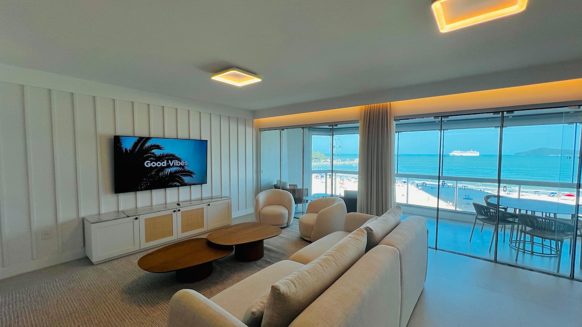 Apartamento de alto padrão em prédio a beira mar de Balneário Camboriú, Piscina e jacuzzi com vista para o mar e para toda a orla da cidade . Academia, Lavanderia, Portaria 24 horas, vaga de garagem, Ar condicionado , Wi-fi e Smart tv, microondas, forno elétrico, liquidificador, cafeteira, máquina café expresso, sanduicheira, geladeira, fogão elétrico, cama casal, tudo o necessário para uma estadia agradável e confortável com muito charme e comodidade
