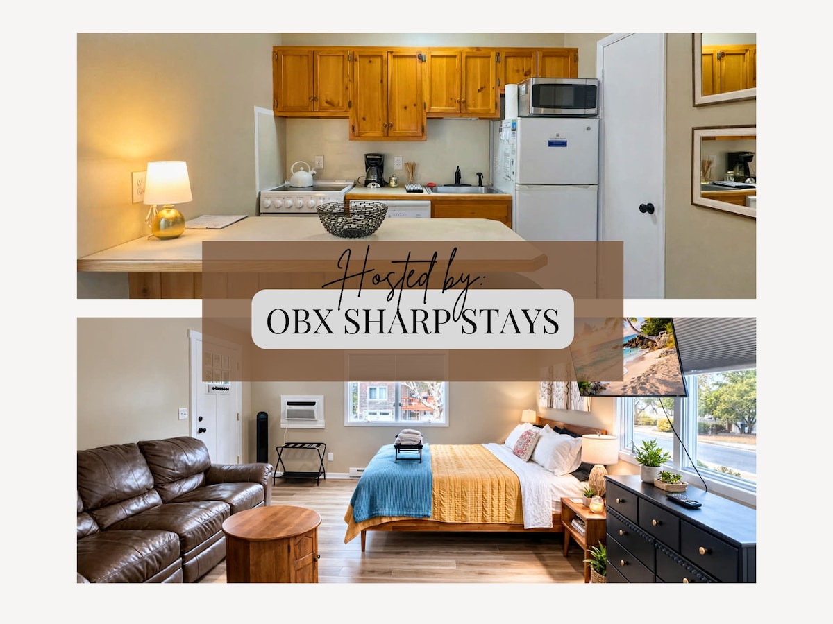 Hosted by OBX Sharp Stays, this pet friendly and fully private king studio at MP 7.5 in Kill Devil Hills offers a full kitchen, bath, and separate exterior entrance. Enjoy kayaks, SUPs, bikes, beach gear, and Exclusive Local Discounts offered by Sharp Stays. Centrally located near shops, dining, the beach and entertainment, everything you need for the perfect OBX stay!
