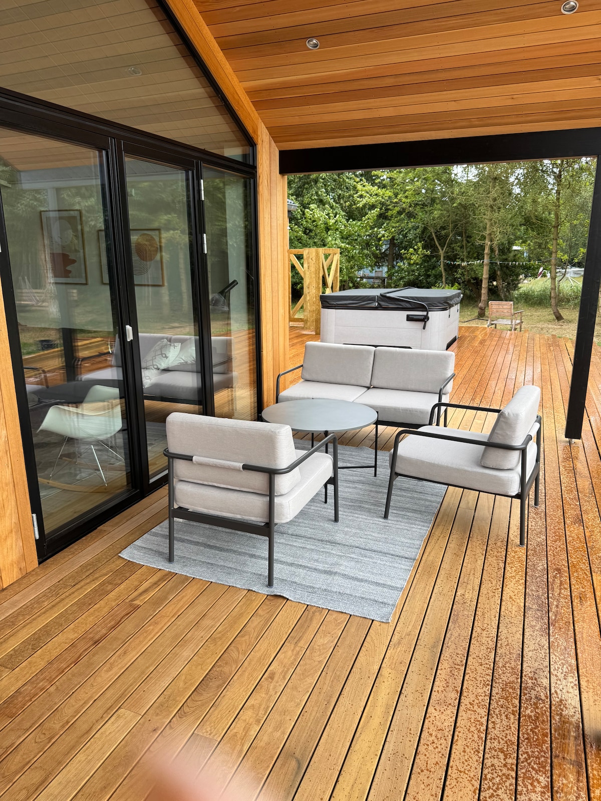 Denne unikke nye bolig fra 2025 har sin helt egen stil. Huset er opført i luksuriøse materialer med ude-spa, sauna og med fokus på alle deltaljer. Huset har en stor solfuld træterrasse hele vejen rundt om huset, og der er aktiviteter til børnene i form af trampolin, gynger, legetårn med rutschebane. Huset er beliggende 800 meter fra Danmarks bedste badestrand.