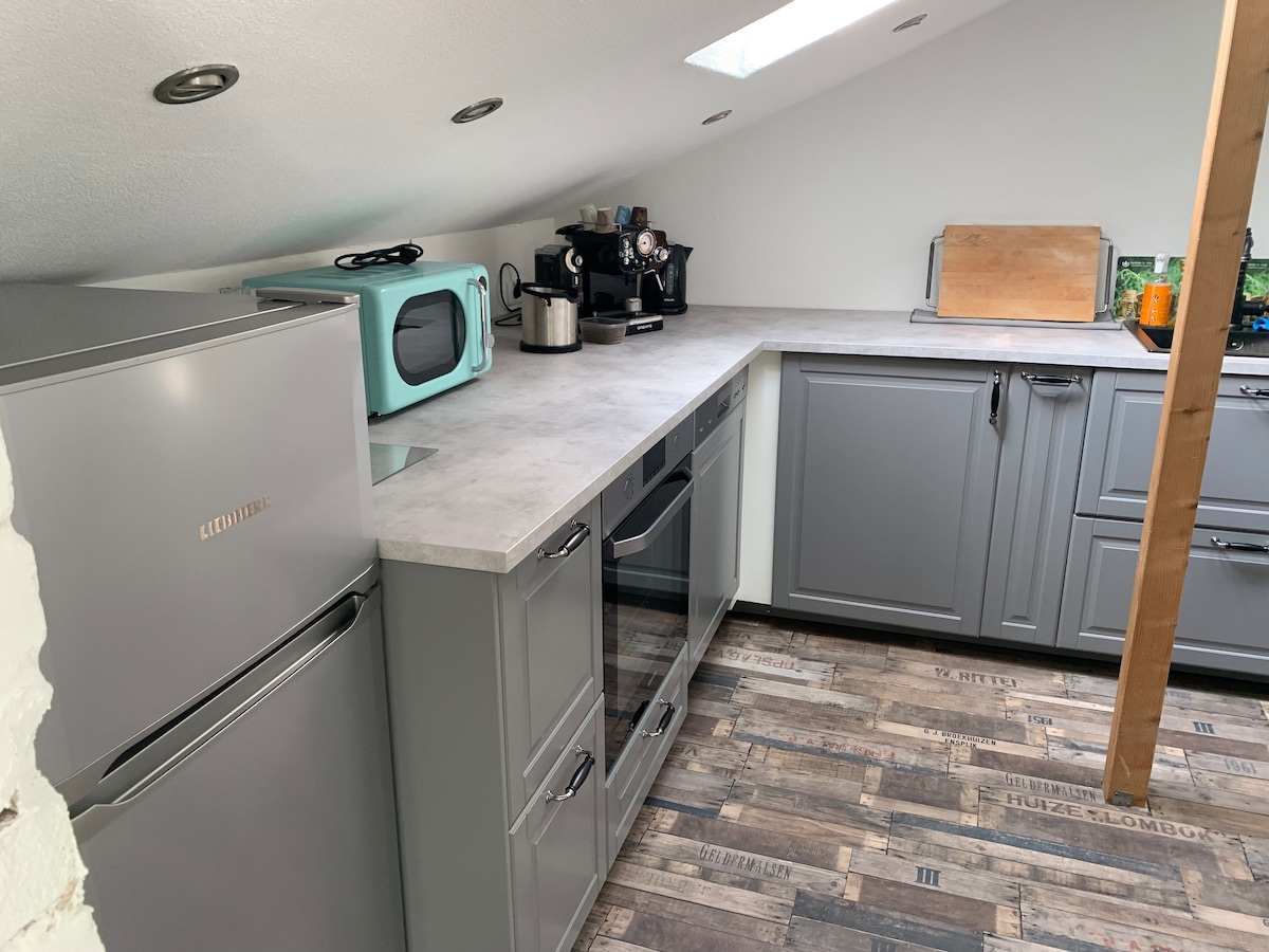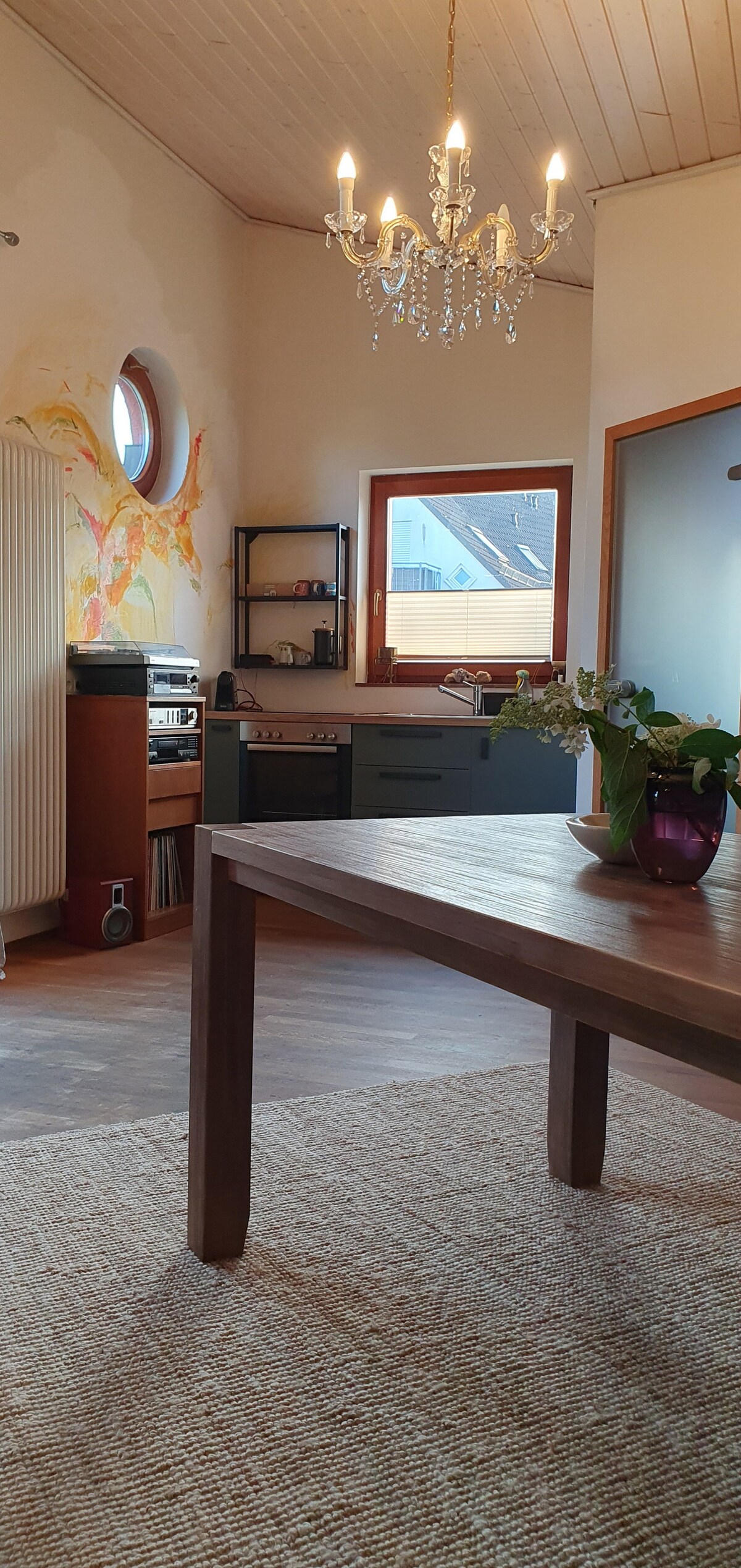 Durch einen Hof vom Haupthaus getrennt, besteht die Wohnung in einer ausgebauten Scheune aus 3 Ebenen. Auf der mittleren Ebene befinden sich Bad und Küchenecke und ein Queensize-Boxspringbett. Über eine steile Stiege ist eine Galerie mit Doppelbett erreichbar. Der Eingangsbereich (untere Etage) befindet sich mit einer Glasfront zum Hof hin. Das Bad, die Küche und die Galerie haben Fenster zum Garten. 6 Min. zu Fuß zur S-Bahn nach Frankfurt (ca 30 min zur City), gute Verbindung zur A3. Z.Zt. 2G!