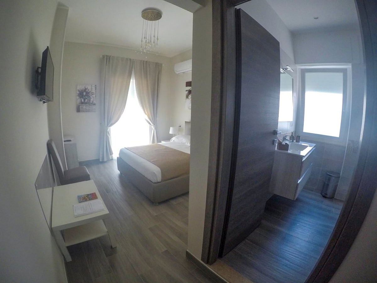 La camera è dotata di un comodo letto matrimoniale, bagno privato e arredi moderni e funzionali. Arredata in modo essenziale e funzionale, la stanza include comodini, lampade per lettura, scrivania, frigo, tavolo, macchina da caffè con cialde, bollitore, TV, aria condizionata e connessione Wi-Fi. Tutte le aree della camera sono accessibili, con bagno privato e marciapiede esterno.