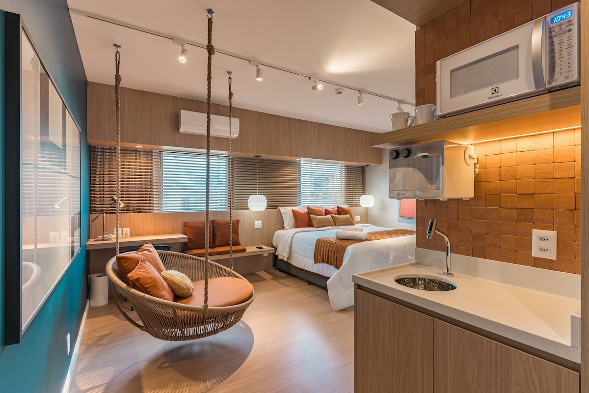 Studio novíssimo, decorado com muito carinho, no cond. IS MOEMA, bairro nobre, localizado próximo a metrô Eucaliptos e Shop. Ibirapuera. Completamente mobiliado, com ar condicionado, armários, 1 cama queen, wi-fi 240mega, smat TV 50", geladeira frostfree, cooktop indução, microondas, cafeteira, cortinas blackout, ducha higiênica e todo enxoval para uma estadia tranquila e aconchegante. E você poderá usufruir do espaço compartilhado do coworking, academia, piscina, ofurô e lavanderia.