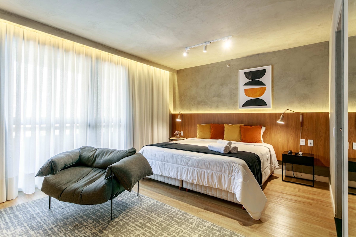 Swivel the 40" TV to watch YouTube or Netflix from the bed or living area. Other thoughtful design details include the big walk-in rain shower and entrance shelving units. Take time as well to sample the gym, pool, and sauna, and to borrow a bike. 30m² studio with brand-new, high-quality furniture. 40' Smartv, with Youtube and Netflix access. Fast internet connection. Cooktop, refrigerator, coffee machine and microwave. Complete cutlery. Big window with blackout curtain. Towels, sheets, pillows and blanket provided. Double bed. Guests will receive card key at front desk after presenting photo ID. Guests can use all the building infrastructure, which is: -Lounge with wi-fi. -Access to Parking lot. -Modern Gym -Rest area -Party area -co-working -Pool -Sauna -Shared bikes -Laundry I work quite close to the apartment and will give all the support as needed. Just reach me on my phone any time! The neighborhood is well served for malls, restaurants, bars, and clubs. Some of the world's biggest companies have offices here, and there are university campuses as well. Famous parks like Parque do Povo and Ibirapuera are only a walk away. If you want to move around São Paulo using public transportation you’ll find Vila Olimpia train station close to the apartment. It is connected to the subway, so it’s quite easy!