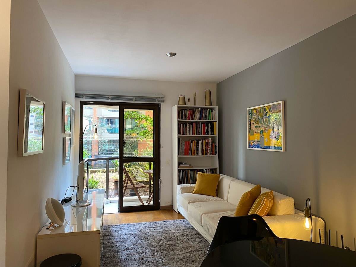 This stylish 50m2 apt. located at Bela Vista, has 24hr doorman. 2 bedrooms (only 1 with AC, and queen bed, the second one is quite small and can be used as an office, fitting a double-sized sofa-bed) and 1 bathroom. With amazing views from every window, it is a great place to work and relax. The private jet tube at the balcony is a fantastic spot to enjoy the city views. Parking - cable/smart tv, fridge with ice maker, oven, wash&dryer, cooktop, microwave, dishwasher and ultra fast internet.