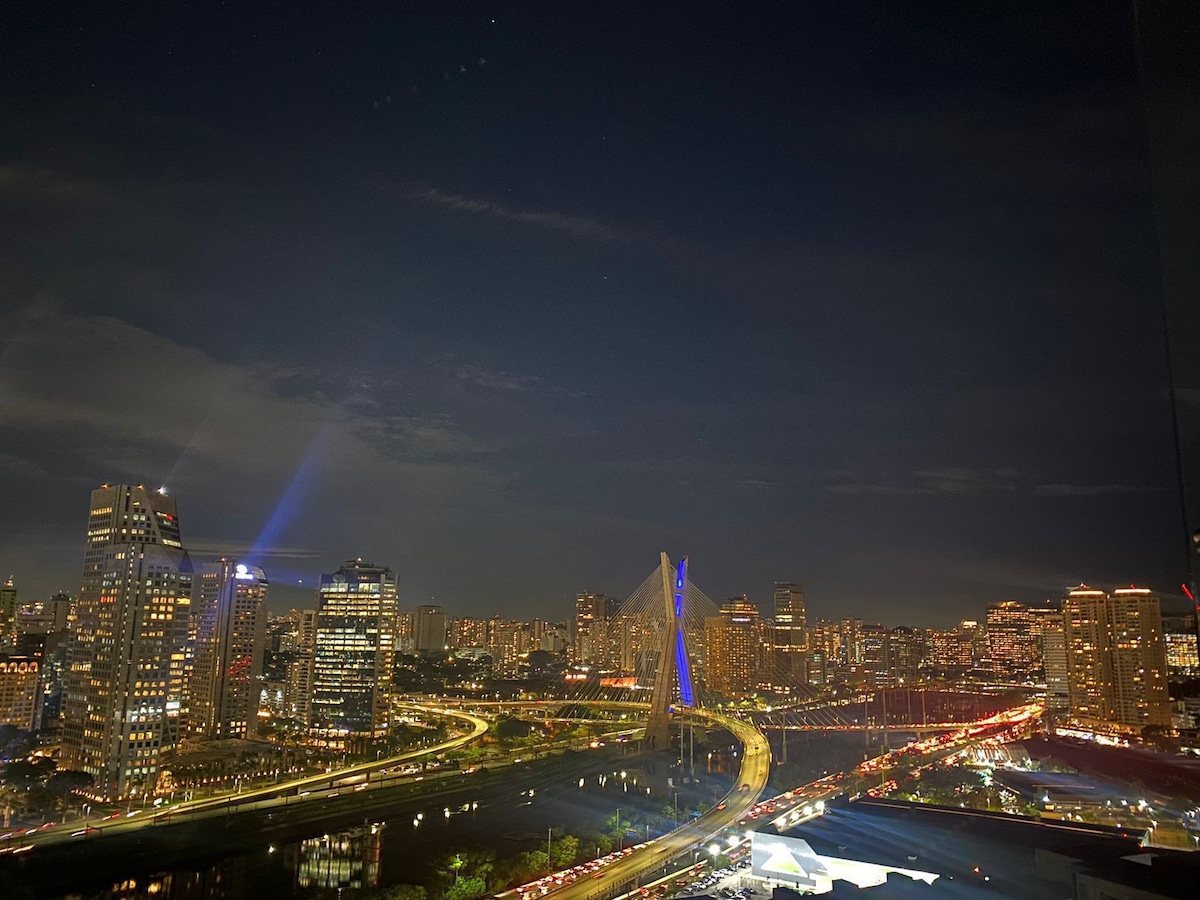 Ap mobiliado,incrível vista para ponte estaiada (10 min da Av. Berrini - Brooklin) 1 dorm,sala c/tv de 65”, armários embutidos,chuveiro à gás, lava/seca,cafeteiras, colchão e sofá de qualidade,varanda c/ mesa e banquetas + mesa bistreaux,microondas,geladeira,rack,wi-fi,utensílios de cozinha, cápsulas de café,chocolates e decorado. Lazer completo (mercado,lavanderia,piscina,academia,sl de ballet,vaga de garagem,sl de reunião, sl de festas, portaria 24 horas). Preço para 2 hóspedes = + 50,00.