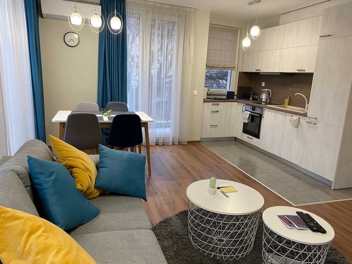 Welcome to my brand new and cosy place, designed with a lot of love,care and thought so you can haver a truly relaxing stay in Plovdiv. The building is just in front of the International Fair Exibition, just a short walk to the City Center across the beautiful Maritza River. The neighbourhood is really lively, communicative and safe. I will be happy to meet you and accomodate you personally, so you will immediatelly feel as an old friend who came to visit :)