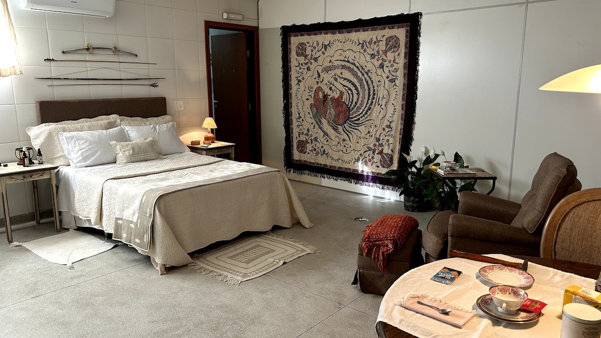Curta uma experiência elegante neste lugar bem-localizado. Lindíssimo apartamento Studio, todo equipado e mobiliado . Localizado na melhor região da cidade próximo a tudo. Essa unidade possui quintal privativo. Roupas de cama, toalhas, sabonete e shampoo estão inclusos.