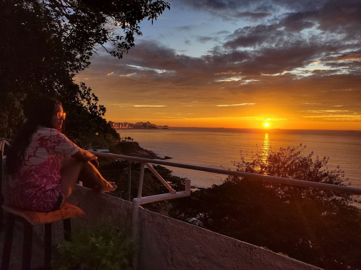 Vista panorâmica 160⁰ para o mar! Nascer do sol em frente a janela. Ótima luminosidade natural. Ventilada. Cortina blackout. Fácil acesso aos transportes. Parte baixa da comunidade do Vidigal. Está a 8 minutos a pé da praia do Vidigal, e de carro, a 5 e 8 minutos das praias do Leblon e Ipanema. Ciclovia/Av. Niemeyer em frente da casa. Cama casal, colchão solteiro, rede. Cozinha equipada: eletrodomésticos e utensílios para cozinhar. Ar condicionado. Smart TV check-in: a partir 14h check-out: 11h