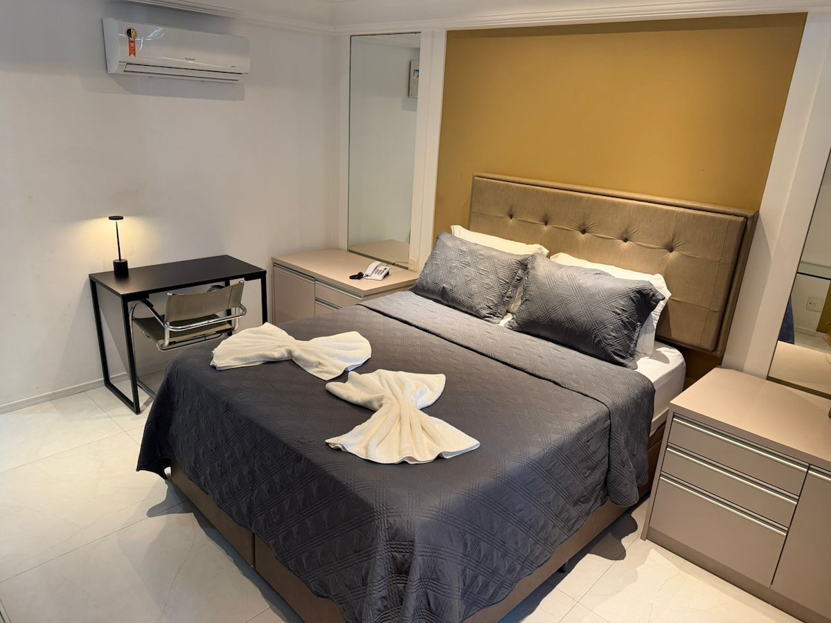 Apart-hotel no Atlântico Flat Service, na quadra da praia. Recepção 24hs. O imóvel acomoda confortavelmente 2 pessoas podendo chegar a 4 pessoas. O local contempla vaga para guarda de carros pequenos, sujeito a espaço. Não conseguindo, existem vagas da prefeitura nas ruas ou garagens cobertas nas proximidades. Ao reservar sua estadia conosco você afirma que leu as informações da hospedagem na descrição do espaço, e regas da casa, concordando assim com o estabelecido.