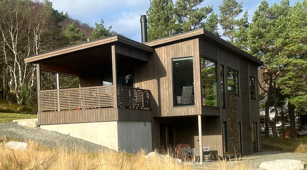Flott feriehus i naturskjønne omgivelser med eget innendørs svømmebasseng, boblebad og sauna. I den smakfullt innredede stuen er det åpen kjøkkenløsning med stort spisebord med plass til alle rundt bordet. Der kan man kose seg med et godt måltid sammen med familie og venner. Merkede turstier i området fører dere til fine topper. En av Norges flotteste golfbaner ligger i nærheten. Gode fiskemuligheter i sjøen/havet nede ved brygga 200 m fra feriehuset.