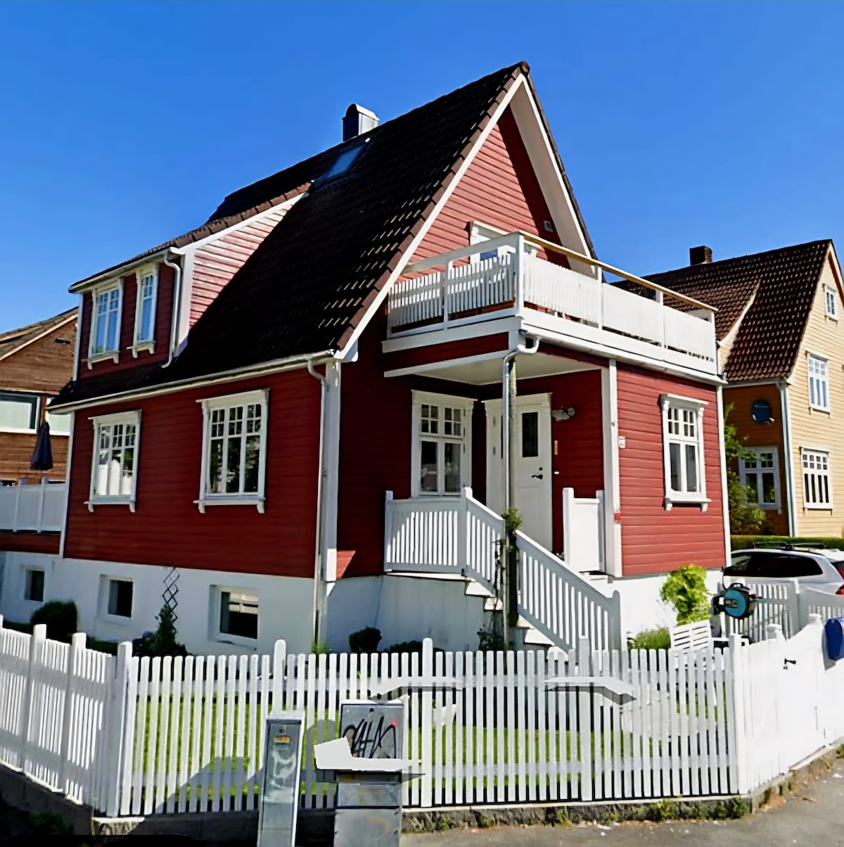 Charming 1913 house in Central Stavanger, just a 10-minute walk from the center. Located in a quiet area with off-street parking, it's perfect for families. The house has 5 bedrooms: 1 double, 1 single, 1 bunk bed, and 2 single that can be extended. Our private home includes a fully equipped kitchen, dining area, BBQ, trampoline, toys, gaming room with extra TV and PS5, and more. We have 2 full bathrooms, an extra toilet, 2 balconies, and an electric car charger.