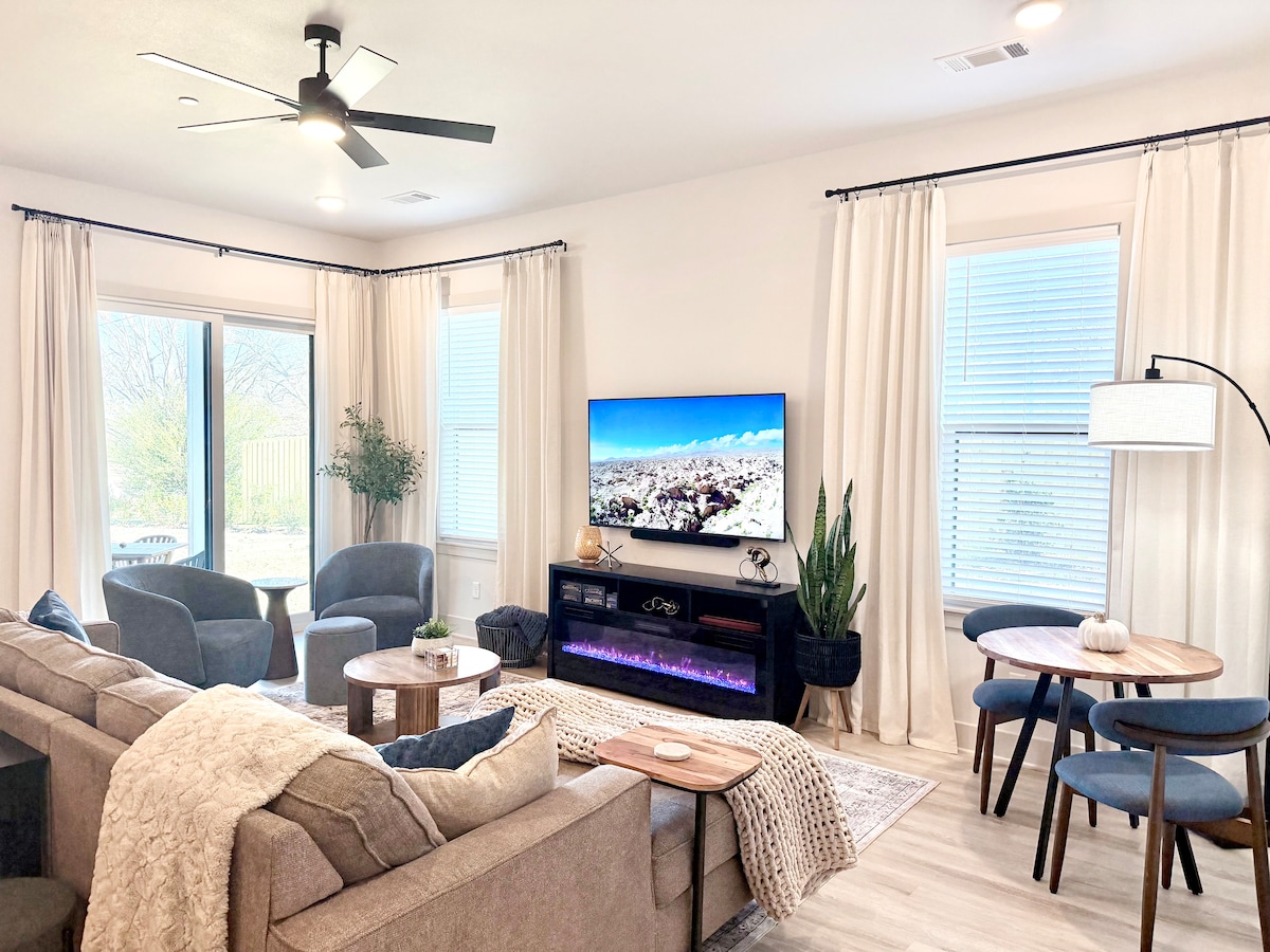 Welcome to our private 1000sqft 2-bedroom apartment in the heart of Downtown Bentonville! - Whole-house water filter and softener system ensures drinkable water from every faucet and shower. - 1st floor unit, 10ft ceiling, 2 king size beds, 1 living room with 75’ TV, 1 full bath and laundry. Covered patio seats. - A full kitchen (no oven) and Jura coffee maker. - 1min walk to bike trail, 5min walk to The Momentary and 3 local coffee shops, ~15min walk to downtown square and restaurants.