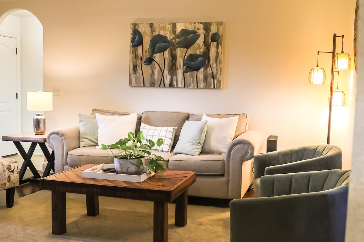 • Newly renovated, beautiful home • Jacuzzi Hot Tub • 3 bedrooms, up to 8 guests • Steps away from a Greenway Trailhead • Outdoor screened patio featuring a TV, couch, and ambient string lights • Large projector screen for a theater experience • Convenient parking, with additional spaces available at nearby park • Unique designer interior • Fully equipped kitchen • Just two houses from a park with a trail and playground • Ideal for remote working • Only 2.6 miles from Walmart Global HQ
