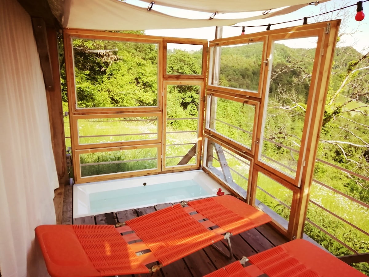 带热水浴缸和全景桑拿的度假木屋