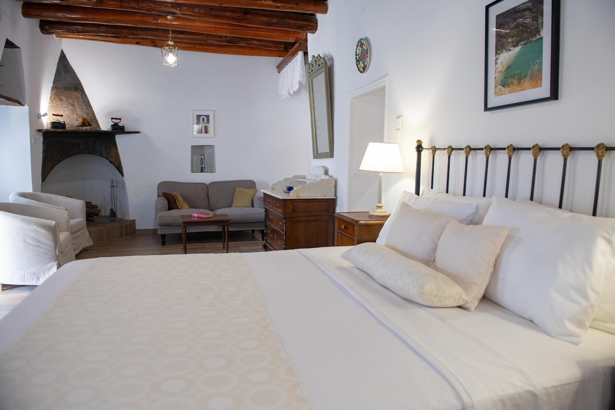The unit “Air” (Wind) is a stone building with thick walls and the low-height doors that served as the main residence of the family. The original features of the residence have been preserved with the built in bed and the traditional fireplace, while a modern kitchen and a bathroom have been added. The total size of the unit is 41m2. The unit has a yard with spectacular water views of Korthi Bay. It has an internal area of 41 m2.