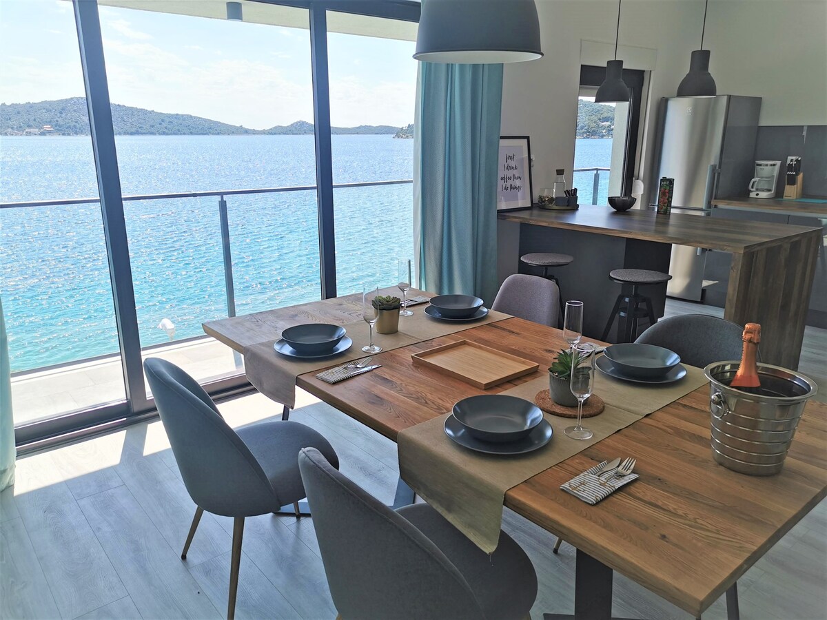 Beach front apartment with beautiful sunsets The perfect vacation home for escaping from the hassles of everyday life. House is situated seafront in beautiful and peaceful cove Uvala Luka. The apartment has a nice balcony with an amazing sea view. In front of the house is a small pebble beach.