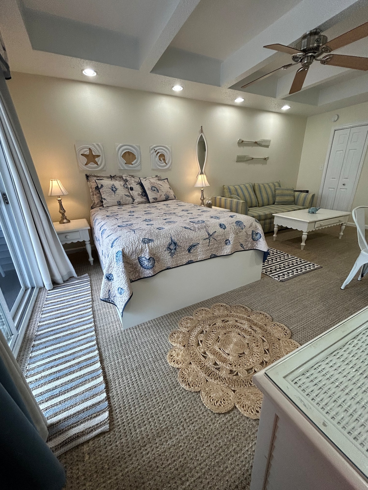 This 1-bathroom efficiency is conveniently located just steps from the beach and Convention Center. This quaint studio offers a full kitchen, washer/dryer, private balcony, living space with queen bed and a queen sleeper sofa, complimentary coffee & tea, linens, 2 beach chairs & umbrella, shampoo, conditioner & body wash, hair dryer, iron, wifi, smart TV fan and much more Must be 24 years old to book.