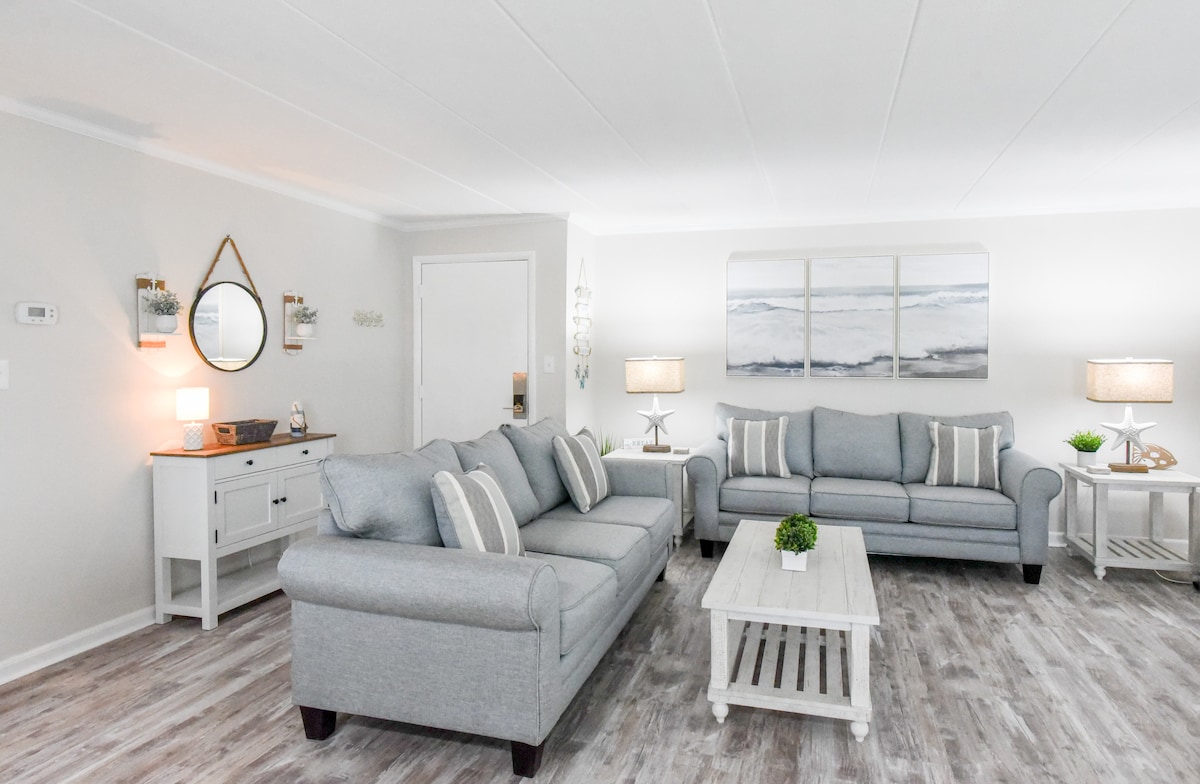 Gorgeous 2 bed, 2 bath 1st floor condo is on 42nd st. Ocean side! Newly renovated, modern and clean condo sleeps 8 (air mattress for 2)has everything you need to feel like you’re at home away from home! Beautifully decorated and complete with stainless steel appliances, fully equipped kitchen, WiFi, a color changing gas fireplace, 80” tv, and is furnished with linens and towels. Just steps to the beach, convention canter and walking distance to the bars such as Seacrets, Coconuts and Taphouse.