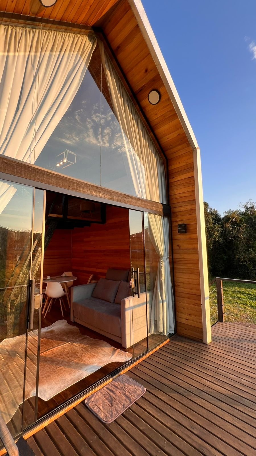 Cabana Sou Aconchego Refúgio aconchegante e sofisticado cercado pela natureza, ideal para casais, mas comporta até 4 pessoas. A cabana oferece banheira de hidromassagem, Wi-Fi, cozinha completa, banheiro amplo com box de seixos, sala com sofá-cama, mezanino com cama king-size, deck com rede relax e fire pit externo. Cercada por belas paisagens, o entorno conta com vaquinhas mansas que os hóspedes podem alimentar. Perfeita para relaxar, curtir a tranquilidade e apreciar uma vista incrível!