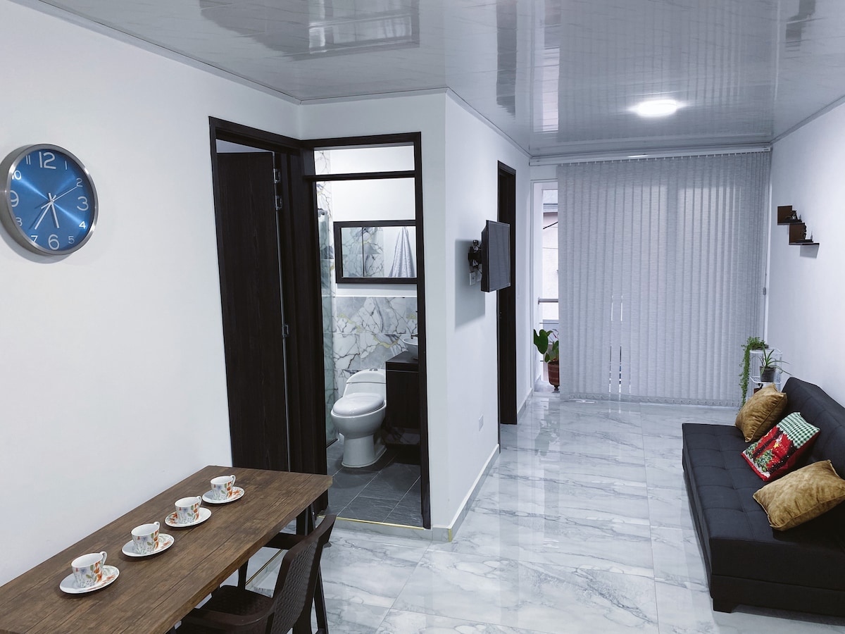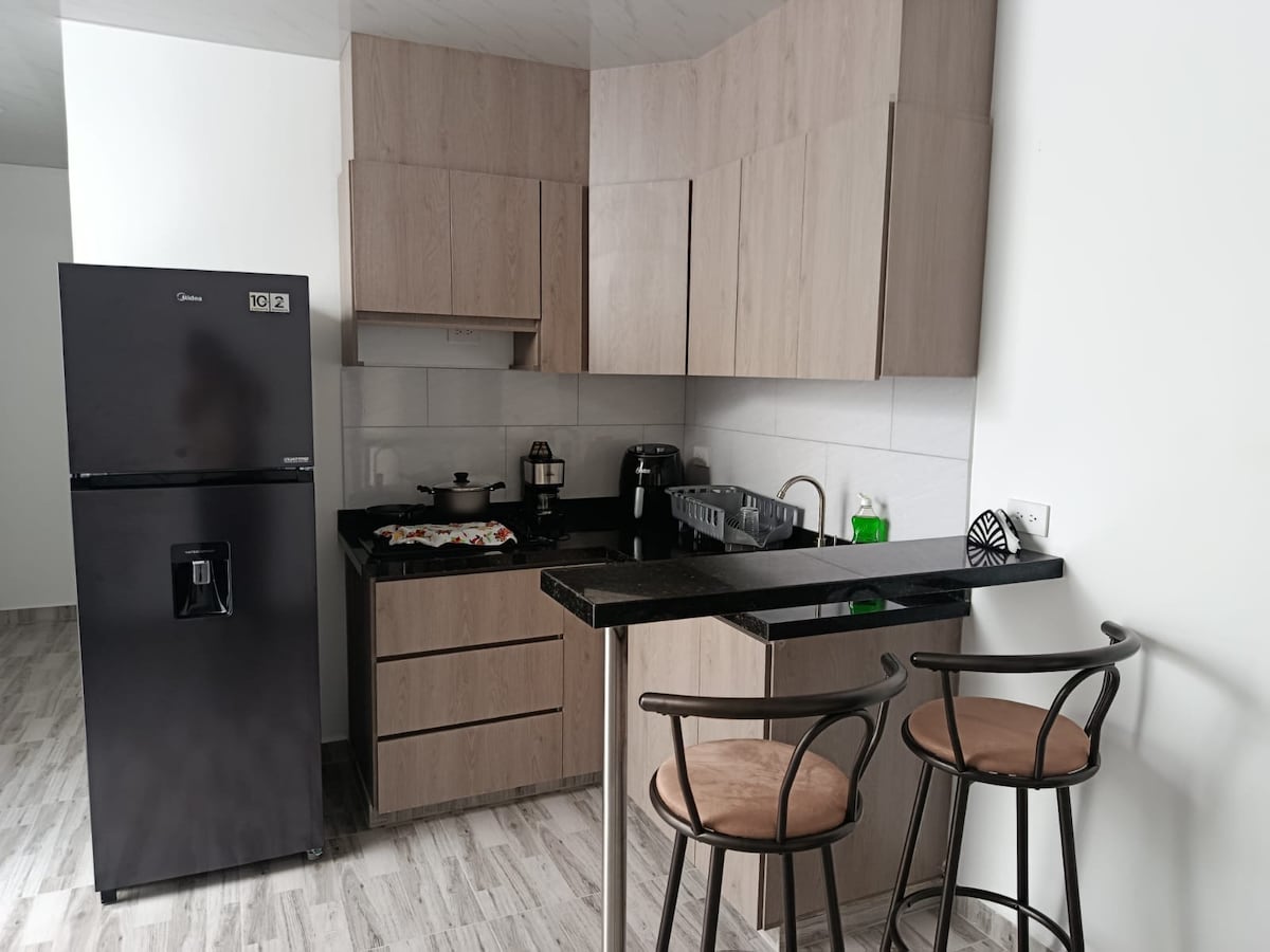 Acojedor, limpio y comodo apartaestudio para disfrutar con amigos y familia. Cuenta con una habitacion; Con dos camas, una doble y una sencilla para un grupo de tres personas. En adicion, cuenta con aire acondicionado, TV, nevera, estufa y cocina equipada con todos sus utensilios. Baño con ducha caliente, tanque con reserva de agua y una mesa. Este alojamiento se encuentra cerca a la estacion de bomberos, supermercados y parques. Ademas, tiene entrada independiente y estacionamientos cerca.