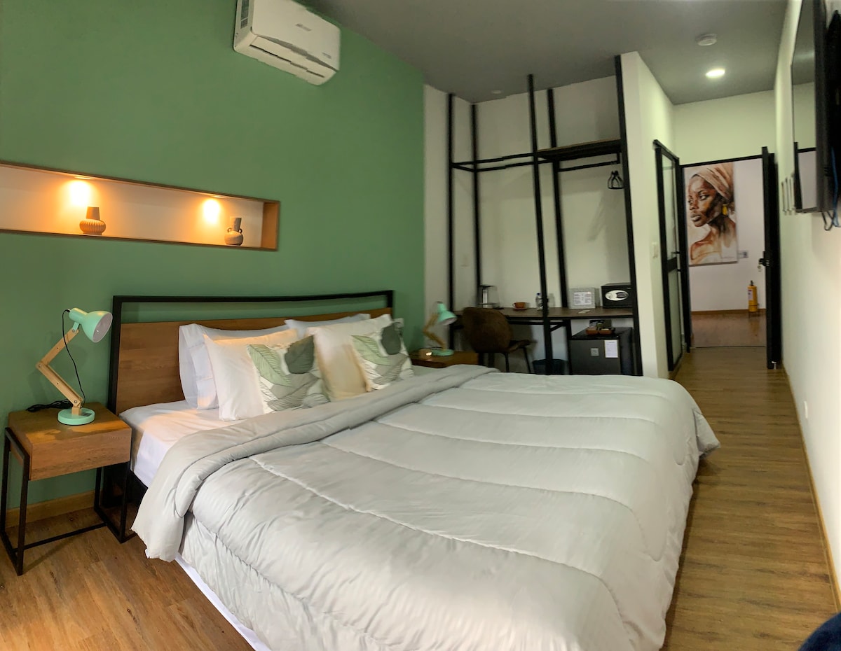Despierte con impresionantes vistas a la montaña en esta espaciosa habitación king size, diseñada para la máxima comodidad. Disfrute de aire acondicionado, tv, wifi, agua caliente y baño privado, lo que garantiza una estancia relajante y sin complicaciones. Rodeado de naturaleza pero cerca del pueblo, este es el refugio perfecto para quienes buscan desconectar mientras exploran la belleza de Roldanillo. A solo 15 minutos a pie del centro de la ciudad. Bar y restaurante en la misma propiedad.