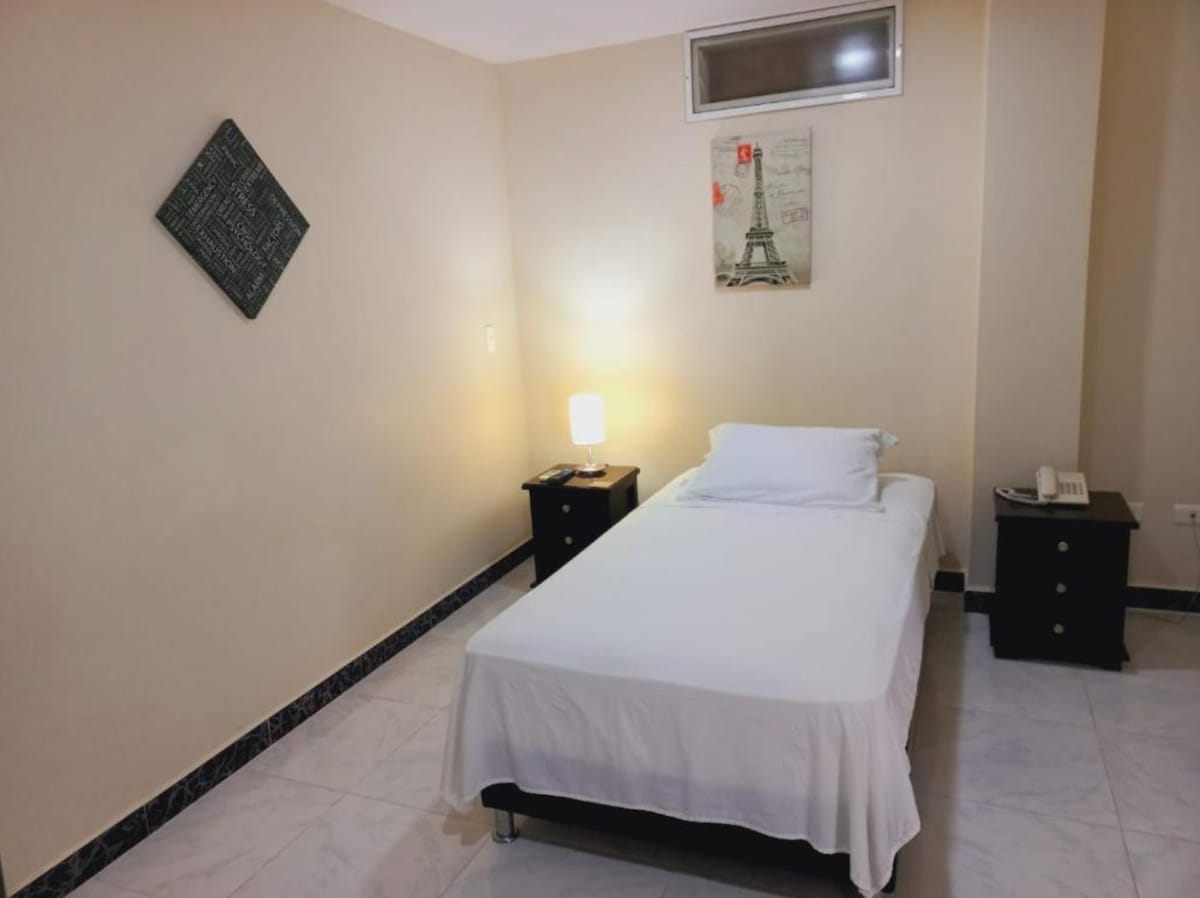 Nuestras habitación ejecutiva es ideal para largas estadías o clientes que buscar una habitación cómoda para un perfecto descanso. nuestra habitación ejecutiva es amplia y con una iluminación natural, las amenidades que cuenta esta habitación son: cama doble, baño privado, closet, televisor smart tv, aire acondicionado. Adicional la tarifa incluye desayuno, parqueadero público y seguro hotelero