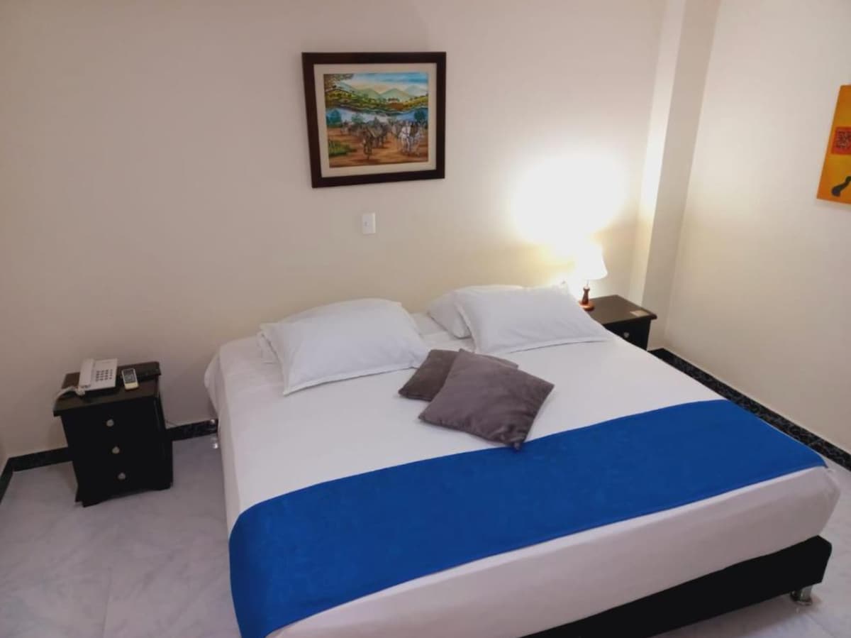 Nuestra cómoda habitación estándar plus cuenta con las siguientes amenidades: Cama doble, televisor smart tv, aire acondicionado, baño privado, wifi gratis,adicional la tarifa le incluye: Coctel de bienvenida, desayuno, parqueadero público y seguro hotelero