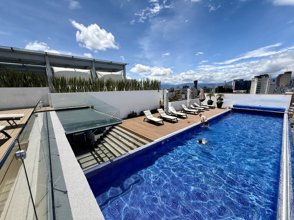 Moderno departamento, en el mejor edificio de la Condesa Piscina climatizada en Roof Garden Vista panorámica de la Ciudad inigualable Seguridad 24/7 Snack Bar con Chef en Piscina Valet Parking dentro del edificio Gimnasio Estacionamiento dentro del edificio 1 cama Queen en cada dormitorio Lugar ideal para familias, parejas, amigos, empresarios, viajeros solos, un lugar para disfrutar como en casa y tener una experiencia única