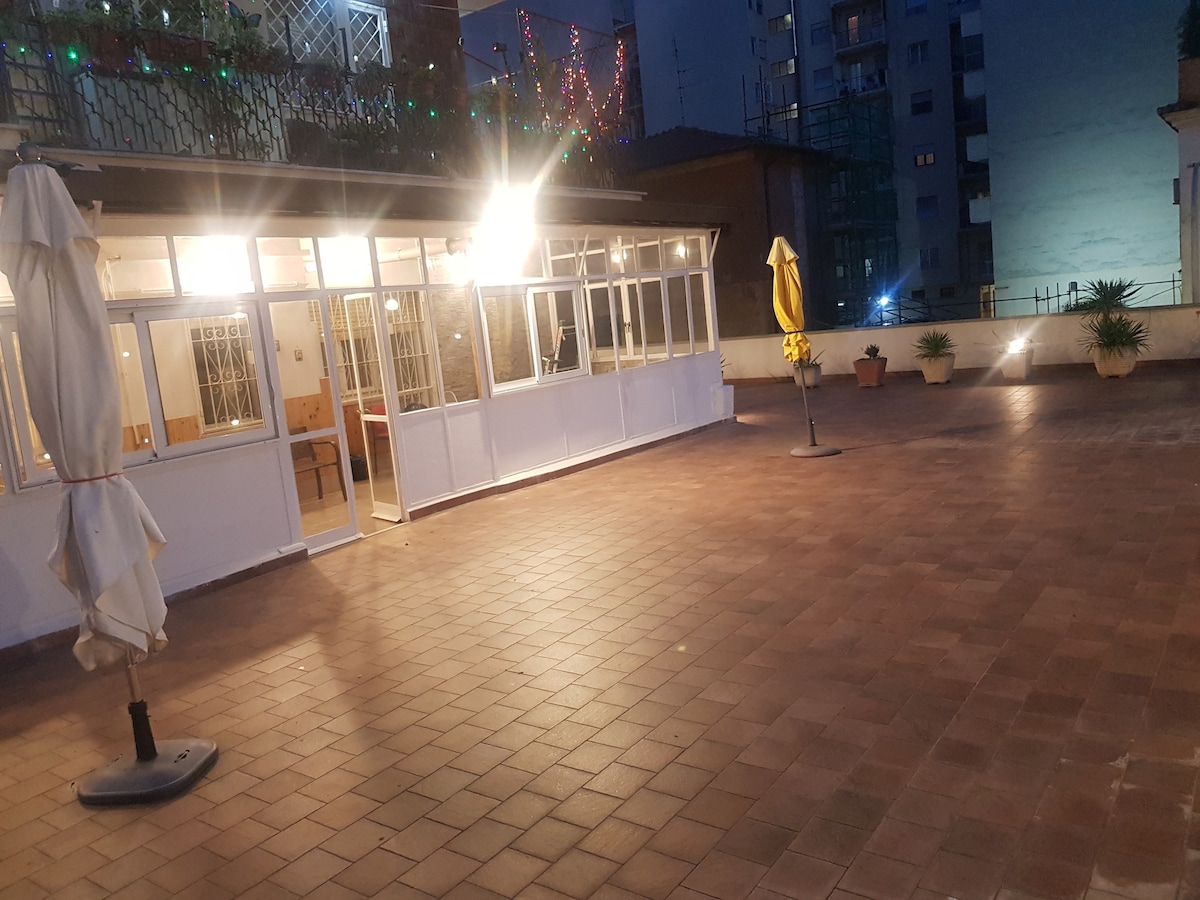 L’appartamento è situato a Roma, in una zona centrale della capitale, a 5 minuti a piedi dalla Metro Bologna, collegata con varie zone, e dalle fermate degli autobus. L'alloggio completamente ristrutturato, è composto da una cucina, una zona giorno, due camere da letto e bagno. Il 2° bagno è riservato ad uso del 3° e 4° ospite.Ambiente insonorizzato. La grande terrazza ed il terrazzino, offrono una meravigliosa vista panoramica della città e permettono di vivere a pieno lo spazio esterno.