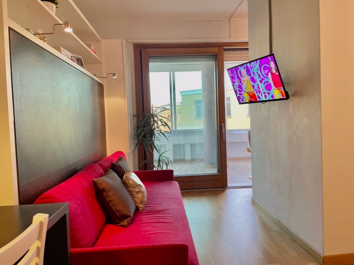 Lovely apartment in Piazza San Giovanni, in the center of Rome, it is possible to reach in 10/15 minutes historical places and monuments such as the Colosseum, Fori Imperiali, Piazza Venezia.The house is located on the second floor of an elegant and modern building, the house is composed of living room with kitchen area, sofa bed, bedroom, bathroom with large shower and a beautiful terrace.The environment is characterized by elegance, attention to detail and modern / vintage functional style.