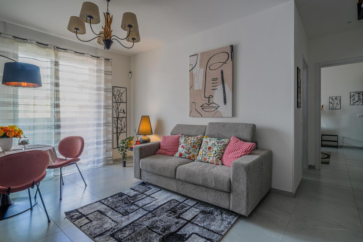 Delizioso appartamento (no condiviso) con ampio terrazzo situato in un edificio di nuova costruzione e dal design moderno, classe energetica (A). La casa è composta da: - soggiorno con comodo divano letto e tv - angolo cottura dotato di ogni accessorio (forno, microonde, lavastoviglie, piano a induzione) - 1 letto matrimoniale queen-size con armadio - 1 bagno con doccia - 1 ampio cortile - Su richiesta, si può prenotare un posto auto nello stesso edificio, al costo extra di 15 € al giorno.