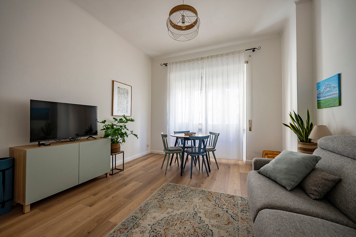 Appartamento elegante e luminoso di 70 mq, recentemente ristrutturato , arredato con mobili su misura. Situato in un palazzo silenzioso nel cuore di Trastevere, unisce comfort moderni e charme romano. Dispone di una camera da letto matrimoniale con letto king-size 180x200 cm, un ampio soggiorno con divano letto e TV, cucina moderna attrezzata, studio per smart working, bagno con doccia e pratici armadi.