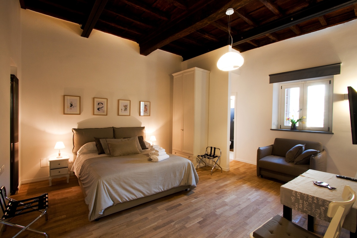 On the top floor of an old Palazzo in the heart of Ancient Rome, Atticus luxury is ideal for couples, singles, or friends. This elegant Studio exceeds all amenities you'd expect from a 5 stars hotel: welcomes you with Prosecco, Breakfast stored items, and Salvatore Ferragamo toiletries. Comfort, Elegance and Privacy for an amazing staying few minutes walk to the Coliseum & the Trajan Forum. Romance also in a glass of wine on the balcony overseeing the city centre and the Roman Forum on its side.